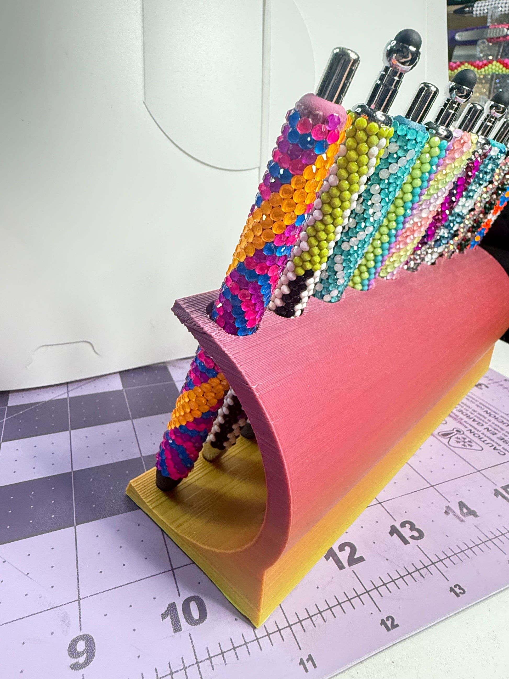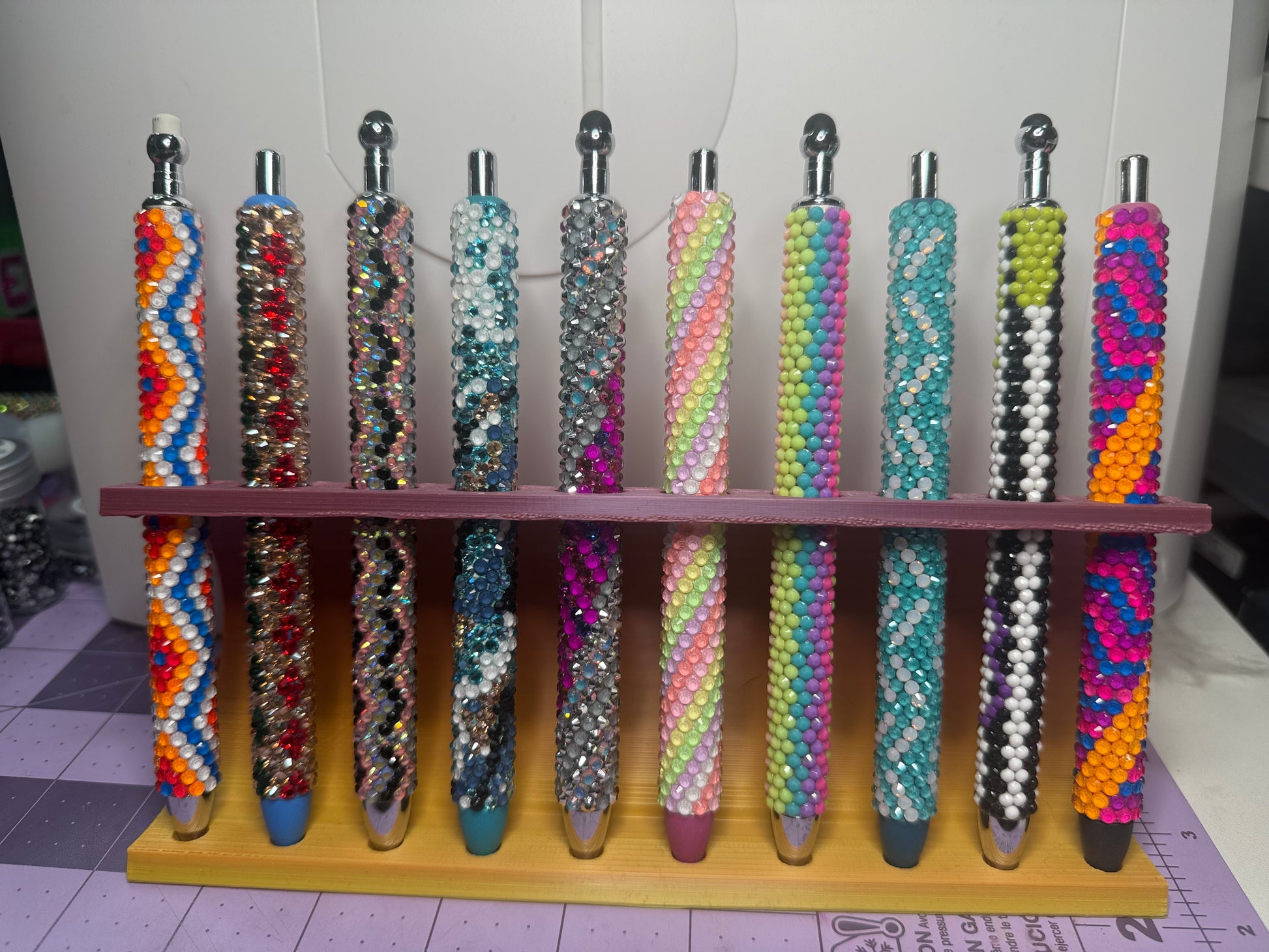 Organize and display your pens with style using this 10-slot Pen Holder! Made with 3D printing technology, it securely holds your pens, pencils, or MAGIC 🪄 Sticks and features a stylish Bar across the top for added stability. Compact and measuring at 8.5”Lx 2.5”Wx 3.5”H, it's perfect for any desk or workspace. (Pens not included)